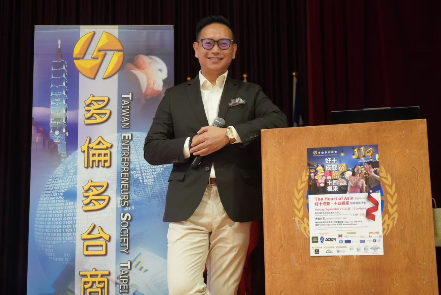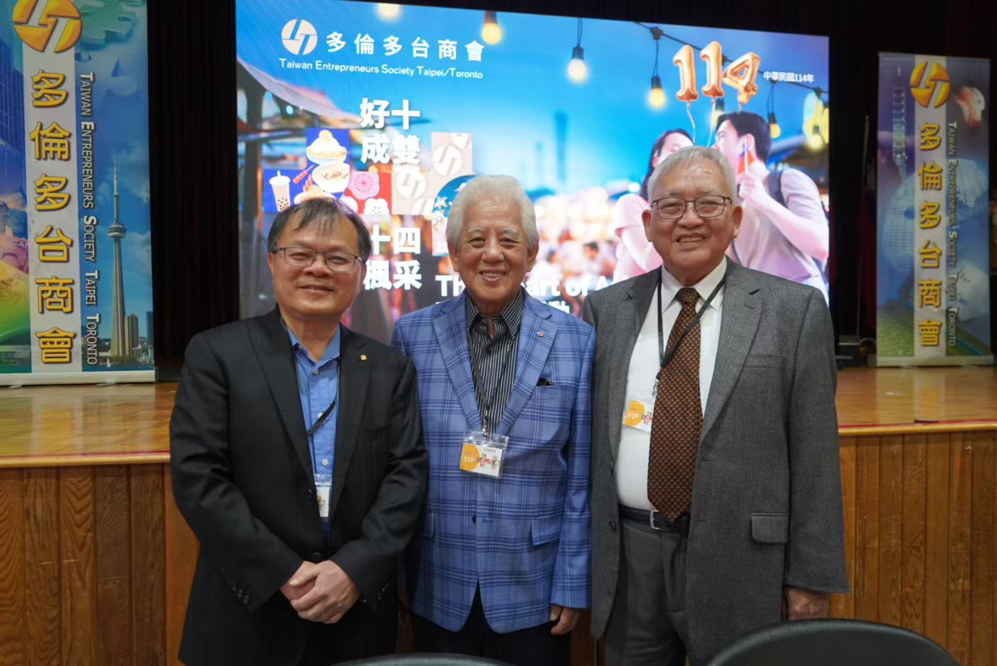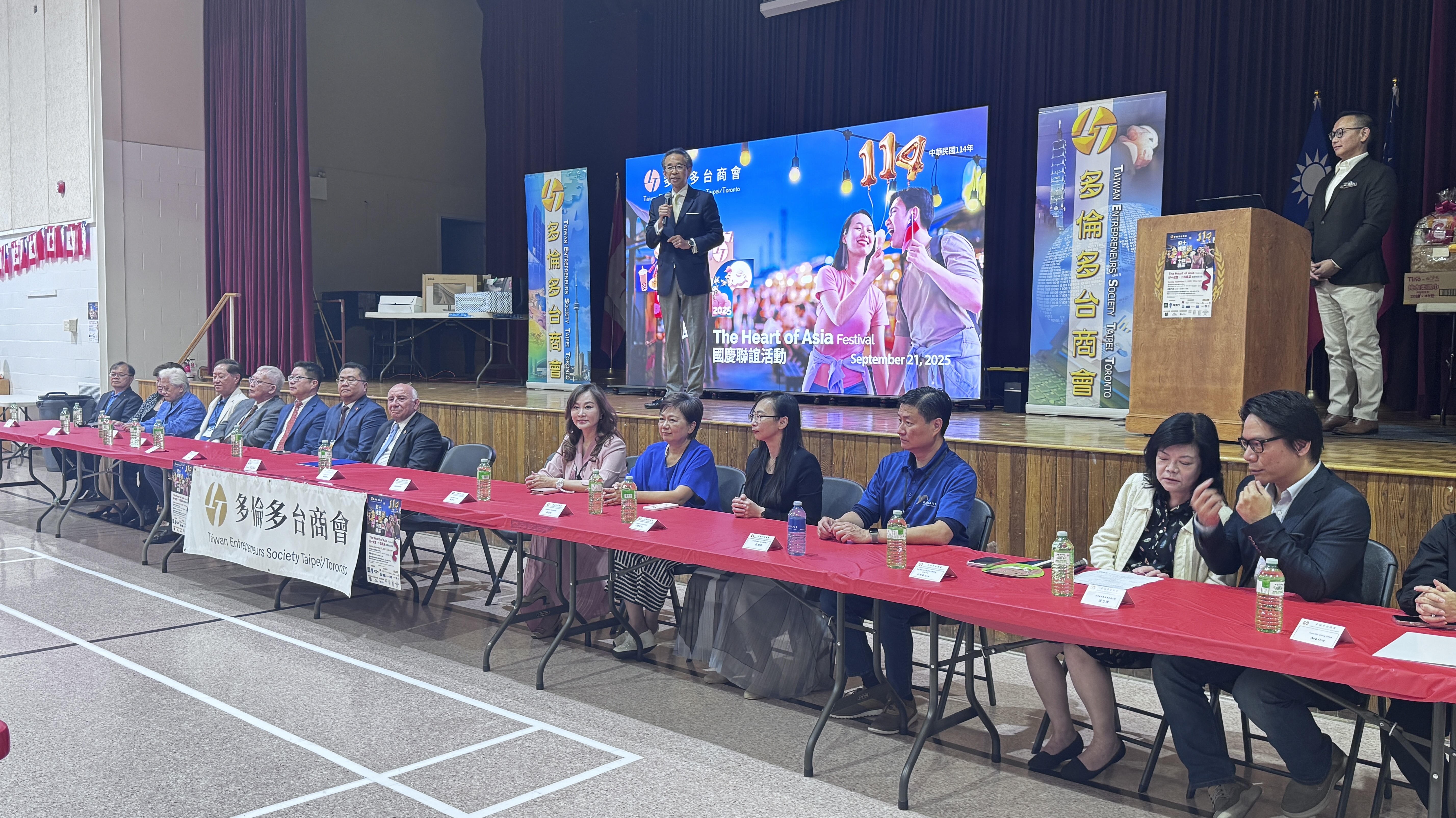 多倫多台商會於2025年9月21日(星期日),在駐多倫多臺北經濟文化辦事處文化中心成功舉辦「2025好十成雙」聯誼活動,共同慶祝中華民國114週年國慶。駐多倫多臺北經濟文化辦事處處長梁毅鵬、文化中心主任藍柏青、副主任許彩鳳、台貿中心主任周之蓉,以及安省省議員白必勤(Aris Babikian)、約克區教育局教育委員會主席 Ron Lynn 等各界嘉賓與近三百位僑胞齊聚一堂,場面熱鬧溫馨。